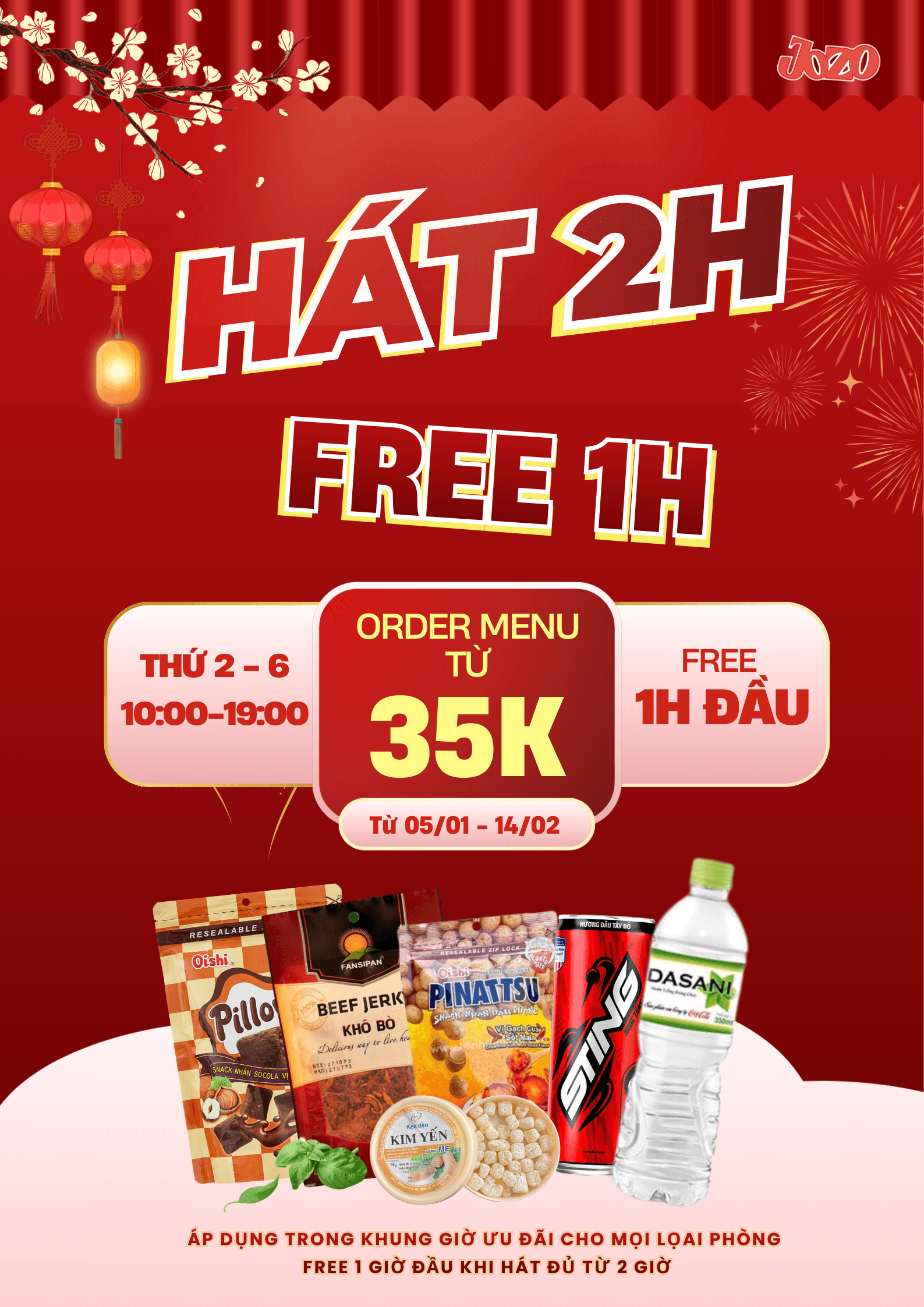 Jozo không phụ thu/tăng giá Tết, giảm 5% khi đặt phòng trước. Lưu ý: Mùng 1 Tết (17/02/2026) Jozo nghỉ.
